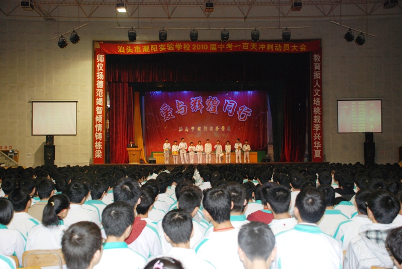 2010年3月13日上午10:00,為鼓舞初三學子奮勇迎接中考,潮陽實驗學校初中部三年級全體師生在體育館隆重召開“初三年級‘我與輝煌同行’中考百日誓師大會”。初中部校長黃根林校長、副校長張杰檳校長、教務處陳劍主任、政教處劉昭武主任、初三年級年級組長石文成老師出席了本次大會。