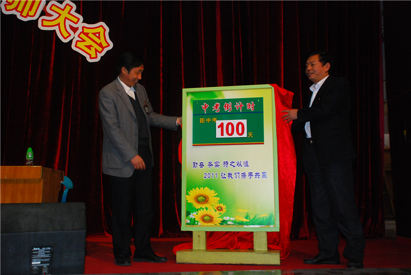 會議由教務(wù)處狄主任主持。大會在莊嚴(yán)的國歌聲中開始,共有八大議程。首先,由總校張校長和學(xué)部黃校長為“百天倒計時”揭牌,宣告中考百日沖刺正式拉開帷幕!接著有學(xué)生代表王杰聰發(fā)言,表達(dá)了全體同學(xué)珍惜最后一百天,搶前爭先,你追我趕,力爭中考取得最好的成績的決心;然后由高小波作為初三年級教師代表發(fā)言,表示了全體初三老師在最后沖刺階段堅守崗位,盡職盡責(zé)、完成學(xué)校中考各項指標(biāo)任務(wù)的決心;同時杜華濤組長做了總結(jié)性發(fā)言,希望全體九年級同學(xué)抓緊時間、講究方法、注重效率、調(diào)整心態(tài),確保2011年中考取得優(yōu)異成績!隨后在學(xué)生代表許昌霖領(lǐng)誓后各班舉行了挑戰(zhàn)與應(yīng)戰(zhàn)儀式,班級代表1班和3班分別進(jìn)行了挑戰(zhàn)和應(yīng)戰(zhàn)的宣誓。