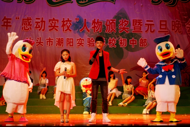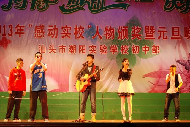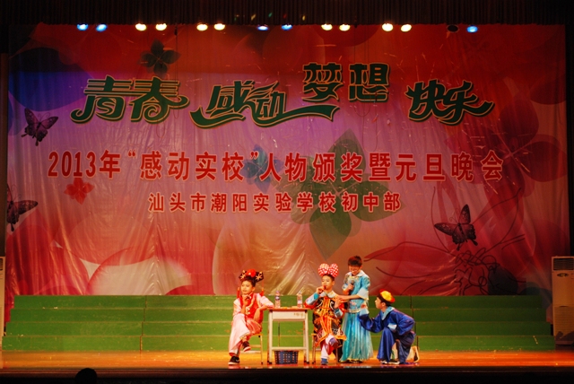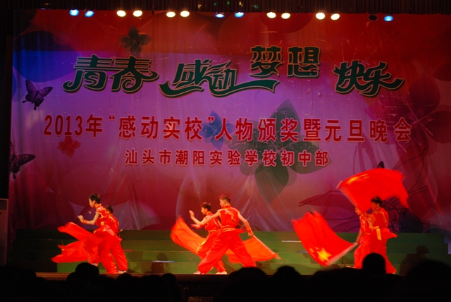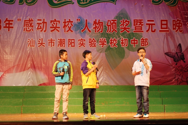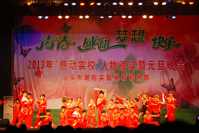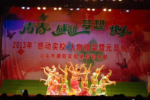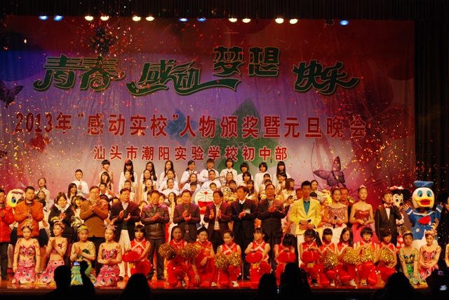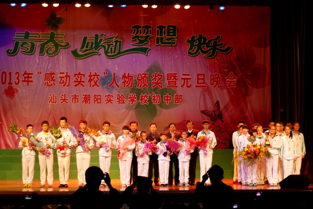 2013年12 月29日晚 ,汕頭市潮陽(yáng)實(shí)驗(yàn)學(xué)校初中部在體育館隆重舉行主題為“青春、感動(dòng)、夢(mèng)想、快樂(lè)” 初中部2013年“感動(dòng)實(shí)校”人物頒獎(jiǎng)暨2014年元旦晚會(huì),潮陽(yáng)區(qū)局長(zhǎng)詹局長(zhǎng)和學(xué)校創(chuàng)辦人鄭董事長(zhǎng)以及學(xué)校校務(wù)委員和初中部行政領(lǐng)導(dǎo)出席了晚會(huì),出席本次晚會(huì)的還有初中部全體師生和部分學(xué)生家長(zhǎng)。