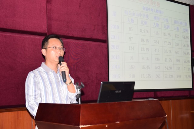 2015年我校中考取得輝煌成績,實現(xiàn)了歷史性突破:潮陽區(qū)中考考生29202人,前23名均被我校統(tǒng)攬,前50名(包含并列共56人)我校占51人,前100名我校占87人,前200名我校占160人。李智宇同學(xué)以790分列汕頭市第二名,黃潛鍔同學(xué)789分列汕頭市第三名。4人進(jìn)入汕頭市總分前十名,8人進(jìn)入汕頭市總分前二十名,750分以上尖子生人數(shù)177人,名列全市第一。 為了全面總結(jié)中考成果,傳承復(fù)習(xí)備考經(jīng)驗,做好2016屆中考備考工作, 10月11日晚7點,潮陽實驗學(xué)校初中部全體教師齊聚四樓多功能廳,隆重舉行2015年中考總結(jié)會議,會議由石文成副校長主持。 首先,教務(wù)處吳劍主任對2015年中考從優(yōu)秀率、單科排名、班級等方面做了一個整體的分析,總結(jié)了中考備考中積累的寶貴經(jīng)驗,并指出了存在的不足之處。接著2015屆初三備課組長就科組中考備考工作作了精彩的總結(jié),與同事們分享備戰(zhàn)中考的寶貴經(jīng)驗,也認(rèn)真反思了備考工作中的不足,并對2016屆中考備考工作提出了切實可行的建議,他們的發(fā)言充實而精練,讓與會的教師獲益良多。 2015屆初三年級組黃高穩(wěn)組長作了九年級中考工作總結(jié),在分享成功喜悅的同時,也表達(dá)了對任課教師努力付出的感謝之情。2016屆初三年級組高小波組長也表達(dá)了將全力以赴爭創(chuàng)佳績的決心。 最后,黃根林校長作了重要講話。他首先向為今年中考做出努力的全體人員表達(dá)了深切的謝意,并總結(jié)了2015屆中考積累的寶貴經(jīng)驗,然后從“和諧備考”、“團(tuán)隊備考”、“科學(xué)備考”、“高效課堂”、“有效訓(xùn)練”、“培優(yōu)輔弱”等六個方面進(jìn)行了2016屆中考動員,他希望2016屆全體初三教師和學(xué)生齊心協(xié)力,鼓足干勁,挑戰(zhàn)極限,再創(chuàng)奇跡。 這次中考總結(jié)會,情況介紹全面,問題分析透徹,報告指導(dǎo)性強,為2016屆初三年級的教育教學(xué)工作梳理了思路,明確了方向,吹響了2016屆中考攻堅戰(zhàn)的號角! ![]() 石文成副校長主持會議 ![]() 中考總結(jié)會議現(xiàn)場 ![]() 吳劍主任作中考成績分析 ![]() 2015屆九年級語文備課組長江玉峰 ![]() 2015屆九年級數(shù)學(xué)備課組長羅群 ![]() 2015屆九年級英語備課組長王玲 ![]() 2015屆九年級物理備課組長張德峰 ![]() 2015屆九年級化學(xué)備課組長袁揚華 ![]() 2015屆九年級政治備課組長趙云鴻 ![]() 2015屆九年級歷史備課組長余玲翠 ![]() 年級組長黃高穩(wěn)作中考工作總結(jié) ![]() 黃根林校長作重要講話 |