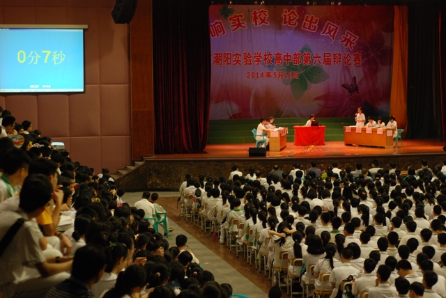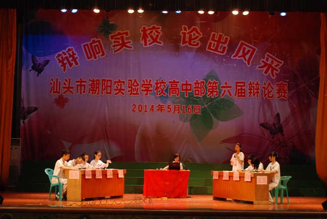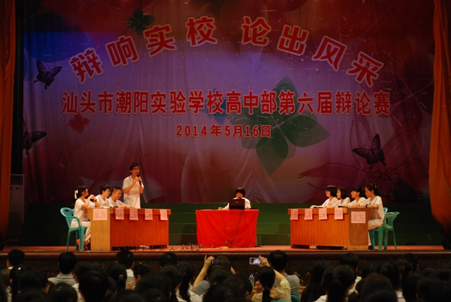 2014年5月15日,潮陽實(shí)驗(yàn)學(xué)校高中部舉行了第六屆“辯響實(shí)校,論出風(fēng)采”辯論賽。高一、高二分別以“中國慈善要從富豪做起/中國慈善要從平民做起”和“未來時(shí)代知識(shí)駕馭資本/未來時(shí)代資本駕馭知識(shí)”為辯題進(jìn)行文理科對(duì)抗賽,參賽選手唇槍舌劍,場(chǎng)面十分激烈,最終決出獲勝方為高一文科代表隊(duì)(反方:中國慈善要從平民做起)和高二文科代表隊(duì)(正方:未來時(shí)代知識(shí)駕馭資本),評(píng)選出優(yōu)秀辯手四位:高一辯手馮斌、蔡嘉和高二辯手陳悅欣、梁鍶韻。學(xué)校副校長(zhǎng)兼高中部負(fù)責(zé)人張復(fù)昌、林少強(qiáng)副校長(zhǎng)給獲獎(jiǎng)代表隊(duì)和選手頒獎(jiǎng),林少強(qiáng)副校長(zhǎng)作現(xiàn)場(chǎng)精彩點(diǎn)評(píng)。