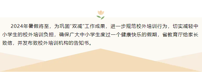 2024年暑假將至,為鞏固“雙減”工作成果,進(jìn)一步規(guī)范校外培訓(xùn)行為,切實(shí)減輕中小學(xué)生的校外培訓(xùn)負(fù)擔(dān),確保廣大中小學(xué)生度過一個(gè)健康快樂的假期,省教育廳給家長致信,并發(fā)布致校外培訓(xùn)機(jī)構(gòu)的告知書。... |