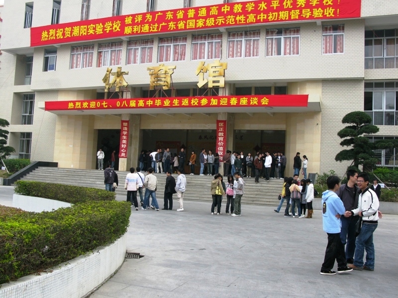 潮陽實(shí)驗(yàn)學(xué)校于2009年1月21日在學(xué)校體育館舉行2007、2008屆高中畢業(yè)生迎春座談會(huì)。兩屆高中畢業(yè)生共有450多人到場(chǎng)。學(xué)校董事長(zhǎng)鄭立平先生、副董事長(zhǎng)陳繼策、校長(zhǎng)張復(fù)昌、高中部校長(zhǎng)劉明棟、高中部副校長(zhǎng)林少?gòu)?qiáng)及校務(wù)委員黃木永等出席了座談會(huì),應(yīng)邀出席的還有學(xué)校愛心基金會(huì)會(huì)長(zhǎng)鄭詩(shī)文先生。座談會(huì)由高中部劉校長(zhǎng)主持。
