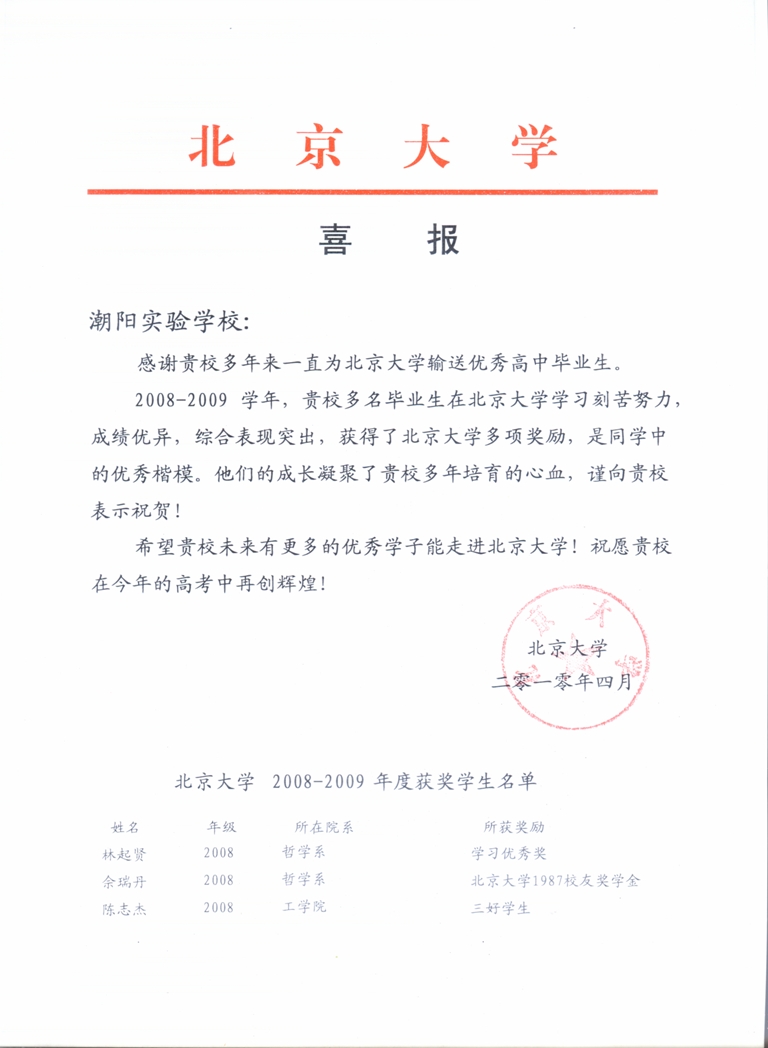 2008-2009學年,貴校多名畢業(yè)生在北京大學學習刻苦努力,成績優(yōu)異,綜合表現(xiàn)突出,獲得北京大學多項獎勵,是同學中的優(yōu)秀楷模。他們的成長凝聚了貴校多年培育的心血,謹向貴校表示祝賀!