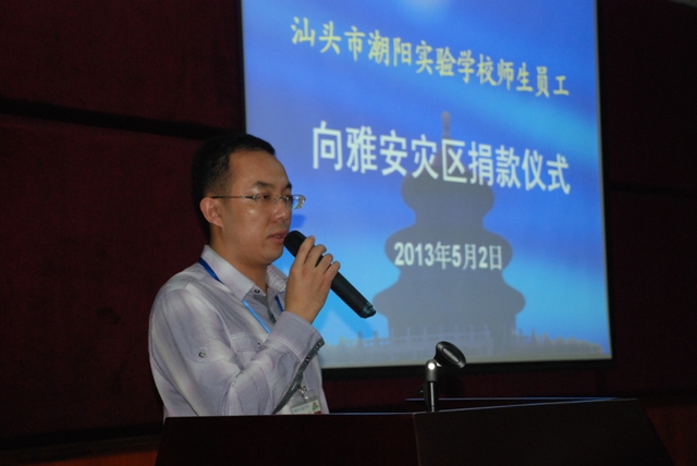 2013年5月2日晚上6點(diǎn)40分,潮陽(yáng)實(shí)驗(yàn)學(xué)校教職員工和學(xué)生在初中部多功能廳為四川雅安災(zāi)區(qū)舉行了簡(jiǎn)樸而隆重的捐款儀式。參加活動(dòng)的有學(xué)校全體校務(wù)委員、各學(xué)部政教處主任、年級(jí)組長(zhǎng)、各學(xué)部每班一位學(xué)生代表。儀式由學(xué)校團(tuán)委書(shū)記鄭楚堅(jiān)主持,學(xué)校黨支部副書(shū)記張杰檳發(fā)表講話,初中一年級(jí)12班陳旭正同學(xué)代表全體同學(xué)發(fā)言。涓涓細(xì)水,匯集成流,本次活動(dòng)共收到師生捐款人民幣共482389.9元+港幣100元+澳元45元。