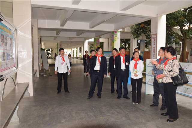 2016年4月12日上午,創(chuàng)建廣東省紅領巾示范學校省級考核工作組梁麗萍組長帶領評估組,在團市委學少部鄭初鋒部長、市教育局梁杰副科長、區(qū)青少年宮鄭銘濤主任的陪同下,蒞臨我校督導檢查少先隊工作。我校張復昌副校長,小學部鄒丹校長、秦世進副校長、王修穩(wěn)副校長、大隊部輔導員胡丹陪同檢查。