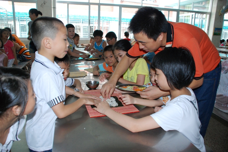 活動開展前,參與的同學們齊聚小學部餐廳,個個興高采烈。餐廳的師傅們也早已為同學們準備好了胡蘿卜、烤紫菜、火腿、米飯等必備材料�;顒釉诤鸂I長的講明要點中展開。同學們領(lǐng)悟后個個躍躍欲試。學生活動開始了,在活動中,各連指導老師們巡回指導,孩子們興致勃勃、分工合作,親身體驗了做壽司的全過程,不僅豐富了他們的知識,還增強了他們的合作意識,并且充分感受到了自己動手的快樂。很快,一卷卷美味誘人的壽司出現(xiàn)在大家眼前�?粗约褐谱鞯膲鬯荆瑢W們爭相品嘗,大家對自己的作品贊不絕口,競相展示,整個餐廳笑聲不斷,快樂連連。最后,活動在孩子們一起分享完自己制作的美味后洋溢著成就感的笑臉中結(jié)束。