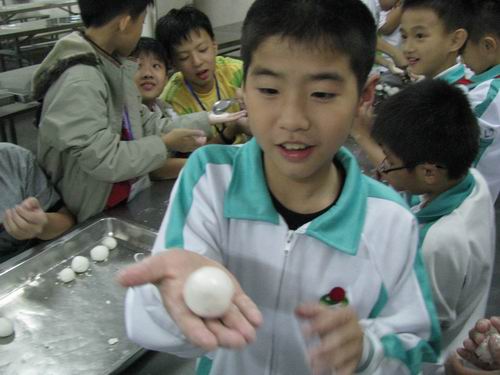 剛開始時,湯圓被同學(xué)們包得大的大,小的�。挥械木拖缶﹦∧樧V一樣,花花的,可大家還是樂此不疲。最后,還是在大老師的指導(dǎo)下,同學(xué)們才將湯圓包得象模象樣了,同時也將兩國學(xué)生深深的友誼包進了小小的湯圓之中。大家吃著自己親手包好的湯圓,你一碗,我一碗,甭提多高興了。小小的湯圓含在嘴里,甜在心里。