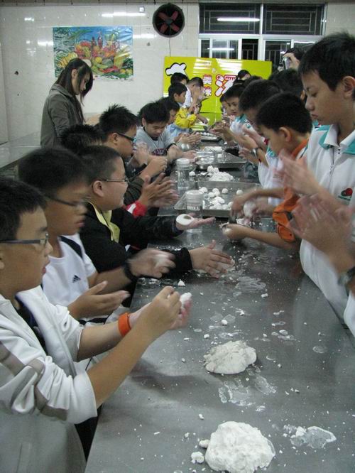 11月20日晚上,兩國學(xué)生在老師的帶領(lǐng)下,興致勃勃的走進了學(xué)校餐廳。望著食堂的叔叔阿姨為同學(xué)們準(zhǔn)備好的糯米粉和紅豆沙,新加坡的同學(xué)頓時傻了眼,這樣的活對他們來說可是生平第一次,甚至有的同學(xué)拿著紅豆沙就往嘴里喂,好在有身旁的實驗學(xué)校“小老師”提醒,才沒有吞下去。在實驗學(xué)校“小老師”的解說下,新加坡的同學(xué)才明白了是要用“白面”包住“紅面”。
