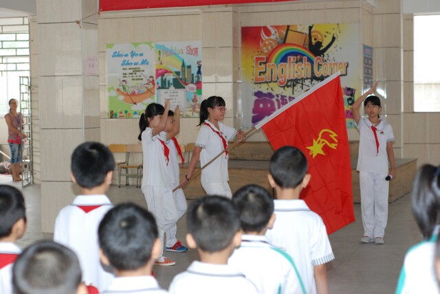 2013年10月14日上午,潮陽實(shí)驗(yàn)學(xué)校小學(xué)部在風(fēng)雨操場(chǎng)舉行了一場(chǎng)隆重而又莊嚴(yán)的新隊(duì)員入隊(duì)儀式。儀式在大隊(duì)長宣布“二年級(jí)新隊(duì)員入隊(duì)儀式開始”中拉開序幕。在嘹亮的《中國少年先鋒隊(duì)隊(duì)歌》之后,四年級(jí)的老隊(duì)員們?yōu)?00名新少先隊(duì)隊(duì)員帶上了鮮艷的紅領(lǐng)巾。鮮艷的隊(duì)旗下,全體少先隊(duì)員們莊嚴(yán)的宣誓聲響徹學(xué)校的上空。鮮艷的紅領(lǐng)巾映著新隊(duì)員的張張笑臉,來自210班的新隊(duì)員代表全體新少先隊(duì)員表達(dá)了能加入到少先隊(duì)這個(gè)大集體的自豪感。儀式的最后,政教處胡主任表達(dá)了對(duì)新隊(duì)員們真誠的祝福和對(duì)全體少先隊(duì)員們殷切的希望。 讓我們真誠地祝愿這些小隊(duì)員們能懷著一顆火熱的心,遵循隊(duì)章,銘記隊(duì)訓(xùn),認(rèn)真學(xué)習(xí),不畏艱難,爭(zhēng)做優(yōu)秀的好隊(duì)員! ![]() 出旗 ![]() 簡潔莊嚴(yán)的隊(duì)會(huì)儀式 ![]() 年級(jí)組長張老師宣布新隊(duì)員名單 ![]() 大姐姐為新隊(duì)員戴上鮮艷的紅領(lǐng)巾 ![]() 隊(duì)員代表講話 ![]() 宣誓 ![]() 呼號(hào)! |