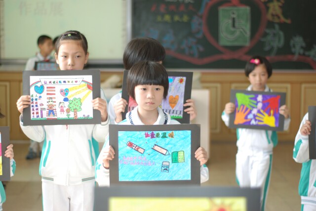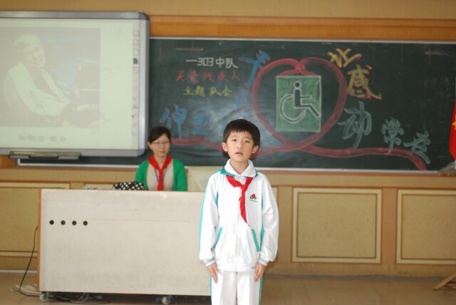 春有百花,秋有月,夏有涼風(fēng),冬有雪。 當(dāng)我們享受這無限美好的生活時(shí),有些人,他們的一生,卻只能以黑暗為伴,與無聲為侶。甚至有的人,精神世界一片混沌。他們有一個(gè)共同的名字——殘疾人。2014年4月11日上午,小學(xué)部303中隊(duì)在公開課室舉行了“伸出你的手,讓感動(dòng)常在”關(guān)愛殘疾人主題隊(duì)會(huì),通過一系列的活動(dòng),關(guān)注殘疾人特別的生活。 隊(duì)會(huì)上,張曼琳、馬宇進(jìn)、歐明潮三位同學(xué)首先給大家介紹了一些身殘志堅(jiān)的殘疾人的事跡,讓同學(xué)們感受到,許多殘疾人雖然面對(duì)著太多的痛苦與無奈,但仍然在頑強(qiáng)的追尋中體現(xiàn)著生活的多彩和生命的意義。接著,李思亨、陳婉釩、呂華銳給大家?guī)砹藛 兜首由系尼斪印罚鷦?dòng)傳神的表演獲得了滿堂彩,讓隊(duì)員們?cè)谛β曋惺艿搅私逃�。�?duì)員們還積極參與了“假如我是殘疾人”體驗(yàn)活動(dòng),通過單手系鞋帶、蒙眼睛找東西、單腳跳等活動(dòng),體驗(yàn)了殘疾人生活的不易。舞蹈《愛的奉獻(xiàn)》、朗誦《把溫暖送進(jìn)你心中》都表達(dá)出了隊(duì)員們要關(guān)愛殘疾人的心聲。303中隊(duì)的小畫家們更是舉辦了一場(chǎng)小型的“作品展”,通過18幅作品,表達(dá)出了對(duì)殘疾人的深深祝福,大聲呼喚:讓關(guān)愛的陽光照亮每一個(gè)殘疾人的心靈。最后,全體師生在手語舞《最好的未來》中結(jié)束了本次隊(duì)會(huì)。