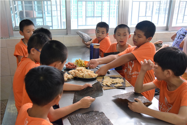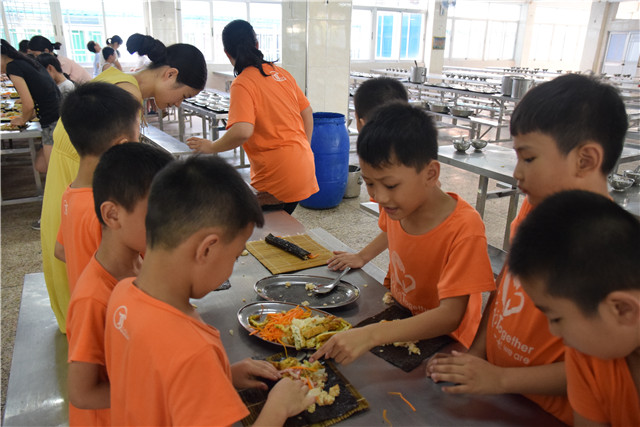 夕陽西斜的時(shí)候,夏令營的營員們開啟了一段DIY美食制作的奇妙之旅,一起學(xué)做三明治和壽司。本著自己動(dòng)手,合作與分享的原則,美食DTY活動(dòng)為營員們提供了一個(gè)生活實(shí)踐的平臺(tái)。餐廳里為大家準(zhǔn)備好了充足的肉松、香腸、火腿、雞蛋、生菜片、香油、米飯、面包、乳酪等原料。一切就緒后,孩子們就開始動(dòng)手制作嘍!小朋友們緊緊圍繞在老師的周圍,大家一齊動(dòng)手學(xué)習(xí)制作美食,很多同學(xué)都是第一次嘗試自己動(dòng)手,都顯得興趣盎然。在老師們的慢慢指導(dǎo)下,小朋友的動(dòng)作變得越來越嫻熟,最終制作出了一盤盤美味的三明治和壽司。聞著美食的香味,孩子們垂涎欲滴,迫不及待地品嘗美食,小嘴不停地夸贊著,臉上洋溢著幸福和快樂。本次活動(dòng)不僅倡導(dǎo)了健康飲食的生活理念,還讓孩子們在動(dòng)手制作美食享受美味的過程中體驗(yàn)到了成功與喜悅。
