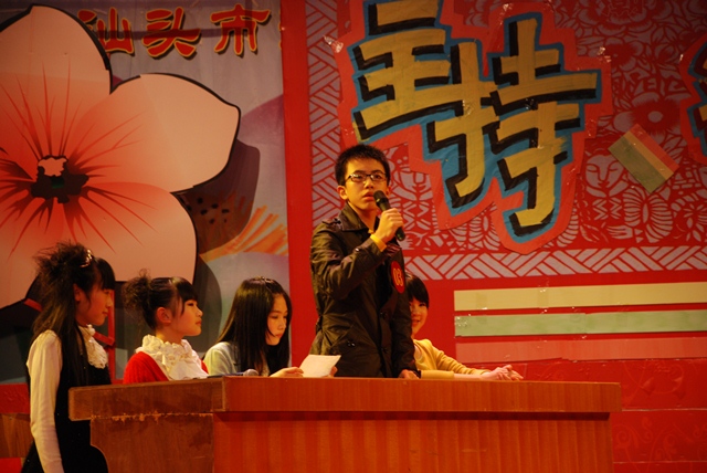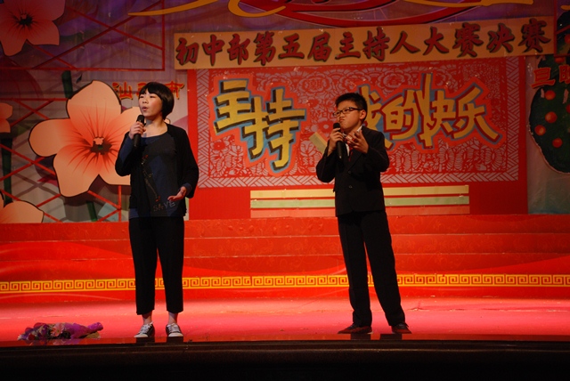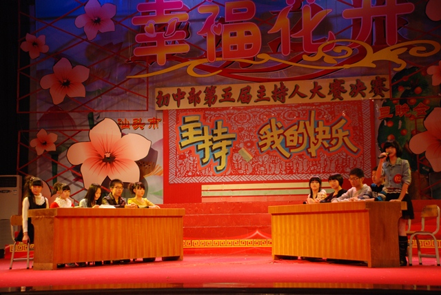 為活躍校園文化,發(fā)掘?qū)W校主持人才,在政教處的組織下, 2012年3月8日晚,初中部在體育館舉行主題為“主持,我的快樂”第五屆實(shí)驗之聲杯主持人大賽決賽。 本次決賽的10名選手是從初賽的125名選手中脫穎而出的佼佼者。他們經(jīng)過精心準(zhǔn)備和培訓(xùn),在決賽中,以飽滿的激情,精彩的表演,出色的表現(xiàn)獲得觀眾的陣陣掌聲。 本次決賽分形體展示、自我介紹、才藝表演、辯論大賽等四個環(huán)節(jié)進(jìn)行,大賽設(shè)置最佳主持人、最佳人氣主持人、最佳臺風(fēng)主持人、最佳才藝主持人等獎項。 ![]() 大賽主持人 ![]()