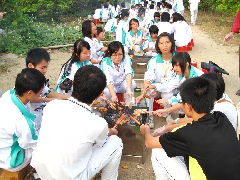 終于到了學(xué)校的農(nóng)場,第一次來這里,很陌生。小心翼翼地走進入,似乎不大敢打擾它的靜謐。農(nóng)場有著大片大片的農(nóng)田,更給人一種祥和生氣。燒烤的炭爐早已準備好,我們走進去時,老師們正陸陸續(xù)續(xù)地把燒得通紅的木炭放入爐中,隨之而起的是“嘩”的一聲,一陣陣淡淡的白煙在農(nóng)田的小路上升起。眾人循著路向前走去,井然有序地就坐。我們學(xué)部學(xué)生會被安排在較后面的小路上,兩個大炭爐早已在等候著我們。大家十來個人圍著爐坐下,沒椅子的就半蹲著,也沒有半句抱怨,大家都滿心期待著燒烤的開始。