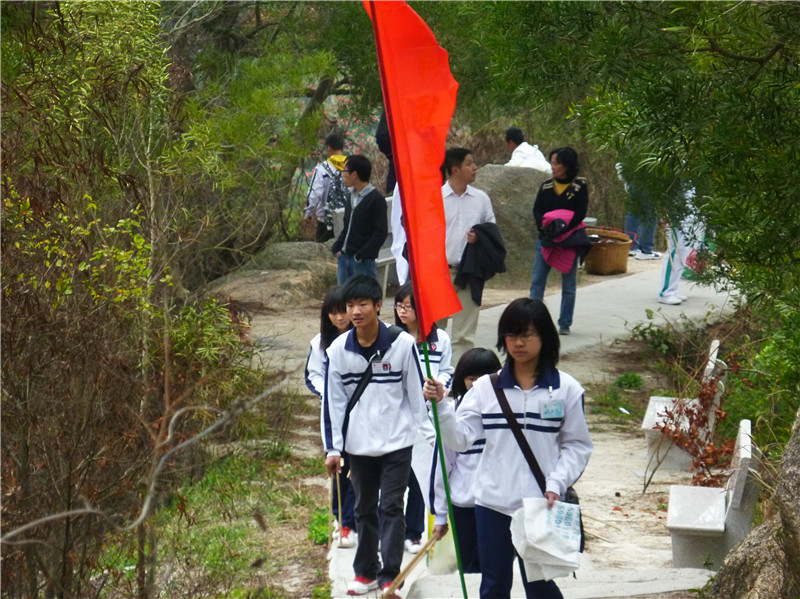 27日早上八點(diǎn),在楊漢葵老師、李文亮老師的組織下,實(shí)接社團(tuán)一行30來(lái)人在潮陽(yáng)一中門口與其它三所兄弟學(xué)校的會(huì)師后,開(kāi)始了環(huán)保登東山活動(dòng)。在李文亮老師陪同下,同學(xué)們一路向上,每到一處垃圾多的地方,大家就停下來(lái),按事先的安排分成幾個(gè)小分隊(duì),有秩序地清理自己周圍的垃圾。同學(xué)們熱情都很高,大家團(tuán)結(jié)協(xié)作,用事先借來(lái)的竹夾子夾垃圾,用廢舊的米袋裝垃圾,迅速高效的完成任務(wù)后繼續(xù)向上攀登。