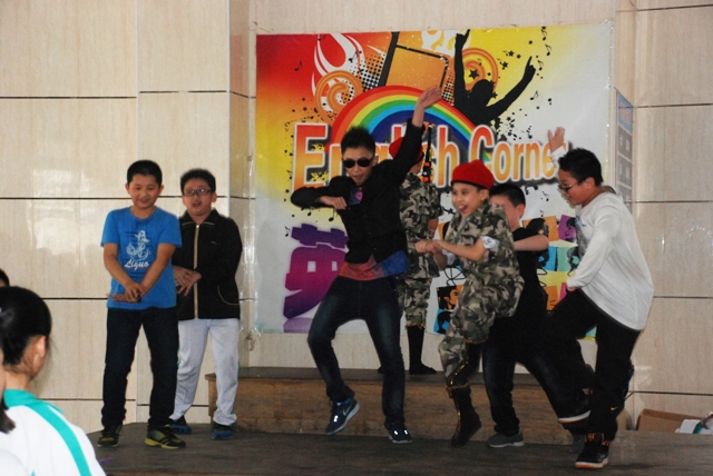 在政教處副主任胡丹的大力鼓勵(lì)下,學(xué)生們?nèi)呵榧ぐ海辉谛≈鞒秩伺砩虹�、陳瑞瀅的帶領(lǐng)下,大家喊出了本次“英語角”活動(dòng)的口號(hào):Read more, speak more, I’ m the best. (多讀、多說、我最棒�。┰跉g快動(dòng)感的旋律中,特邀506班嘉賓表演的《江南Style》,全場沸騰,熱舞high翻天。