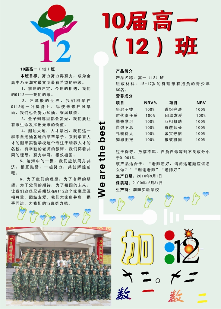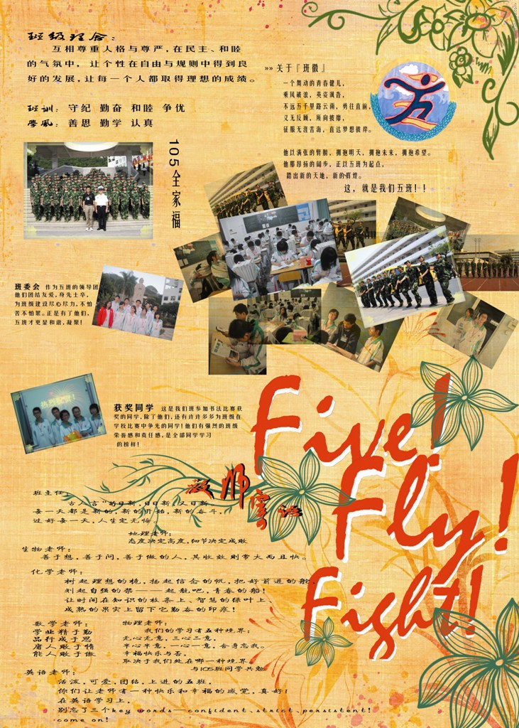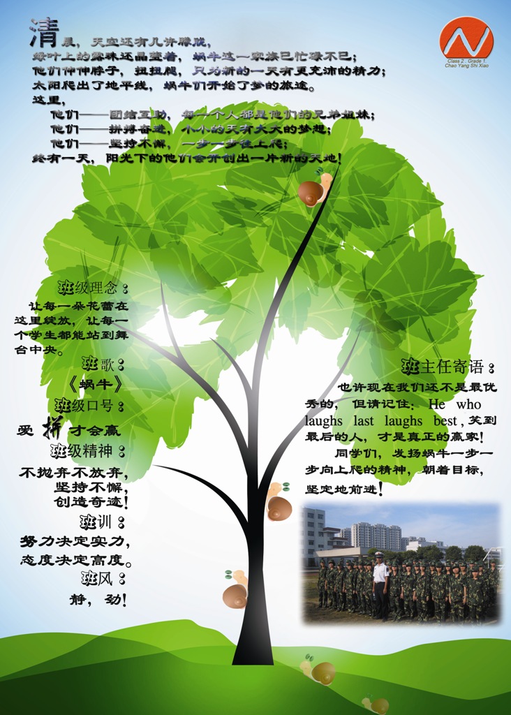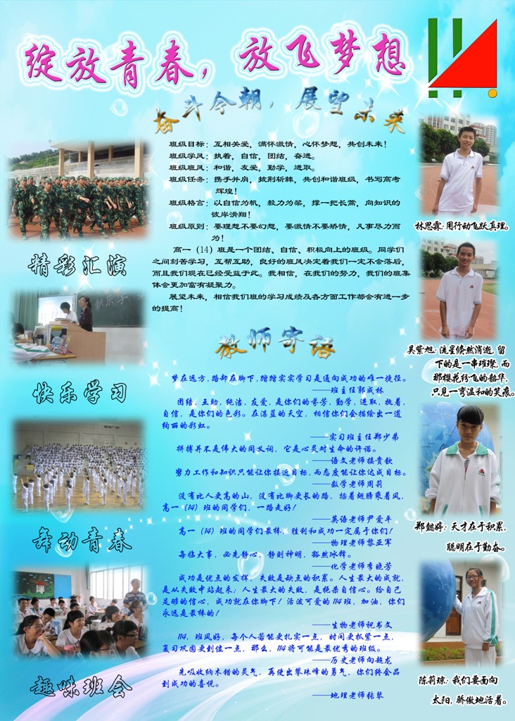為了鼓勵高一同學(xué)建設(shè)班級的熱情,加強班級凝聚力,2010年12月,汕頭市潮陽實驗學(xué)校高一年級開展了一場班級設(shè)計大賽。