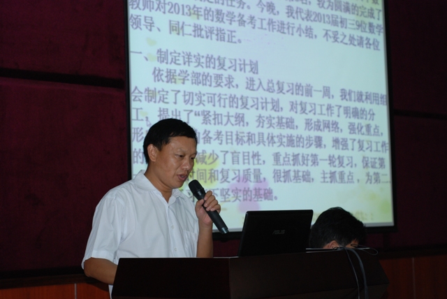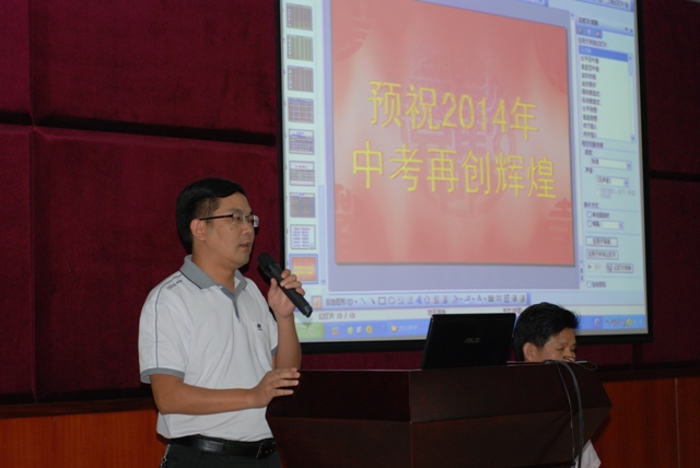 會(huì)議在石文成副校長(zhǎng)文采飛揚(yáng)的開場(chǎng)講話后,宣布總結(jié)大會(huì)正式開始。首先由教務(wù)處吳劍主任通報(bào)了我校2013屆中考成績(jī)并進(jìn)行了細(xì)致分析,提出了需傳承發(fā)揚(yáng)的優(yōu)良傳統(tǒng),也指出了在中考中存在的不足及今后努力的方向。2013屆初三年級(jí)高小波組長(zhǎng)、初三各學(xué)科備課組長(zhǎng)分別就上一學(xué)年年級(jí)組、科組中考備考工作作了精彩的總結(jié),與同事們分享備戰(zhàn)中考的寶貴經(jīng)驗(yàn),認(rèn)真反思了備考工作中的不足,并對(duì)2014屆中考備考工作提供了切實(shí)可行的建議,他們的發(fā)言充實(shí)而精練,讓與會(huì)的教師獲益良多。2014屆初三年級(jí)杜華濤組長(zhǎng)代表全年級(jí)教師表達(dá)了全力以赴爭(zhēng)創(chuàng)佳績(jī)的決心。